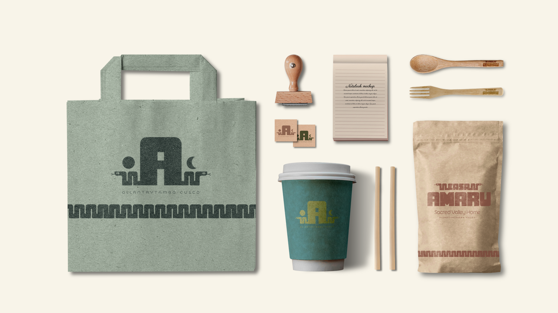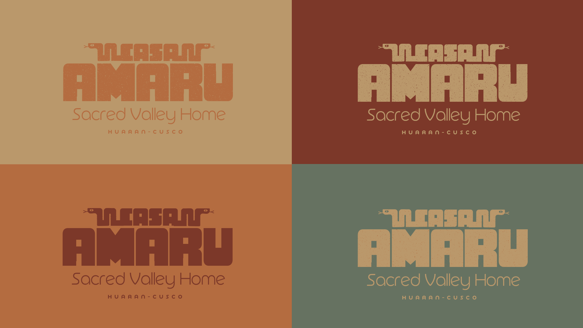 The Casa Amaru isotype merges Andean and spiritual elements. The central "A" symbolizes a refuge and openness to new experiences, while the serpents represent transformation and spiritual connection. The cosmic elements