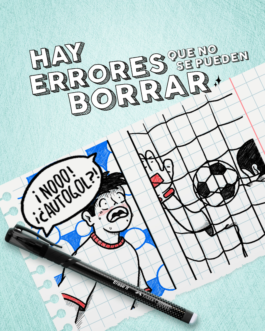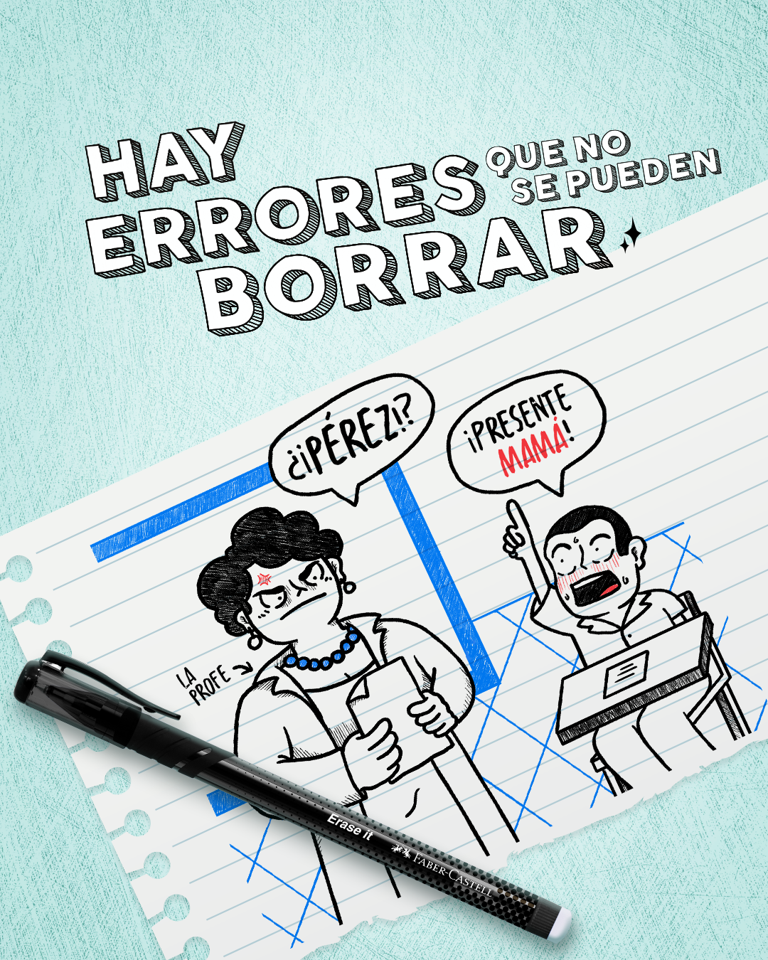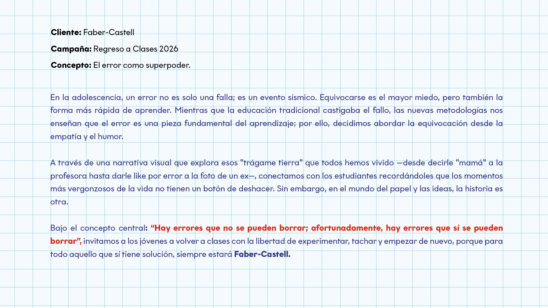 Una campaña que abraza el miedo al ridículo adolescente, contrastando los errores sociales "inborrables" con la libertad de equivocarse y aprender en el papel. Bajo el lema: “Hay errores que no se pueden borrar; afortunadamente, hay errores que sí se pueden borrar”, Faber-Castell te invita a volver a clases sin miedo a fallar.